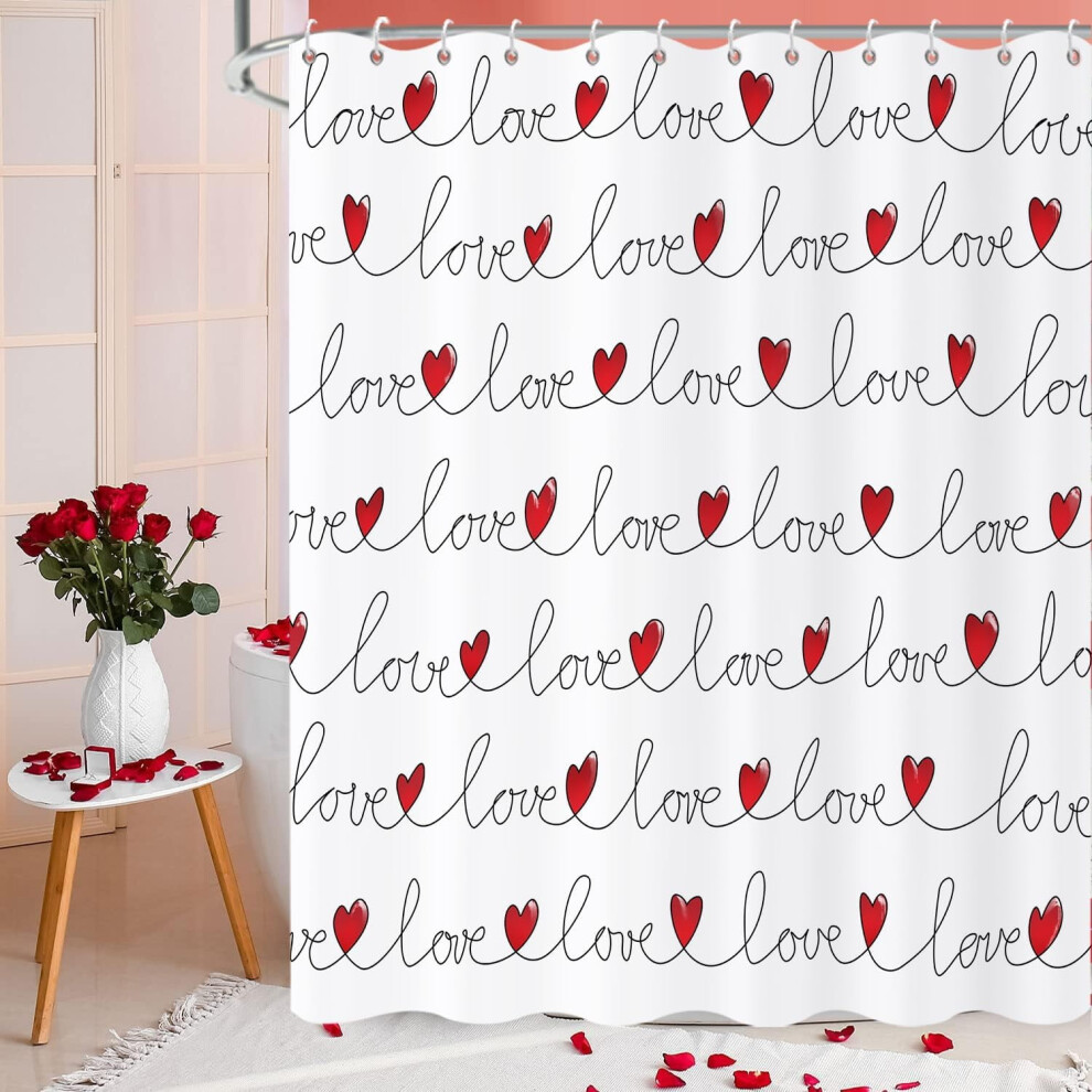 Valentine's Day Shower Curtain â Red Love Hearts on White, Waterproof & Machine Washable, with Hooks, 72"x84", Compatible with Standard Rods