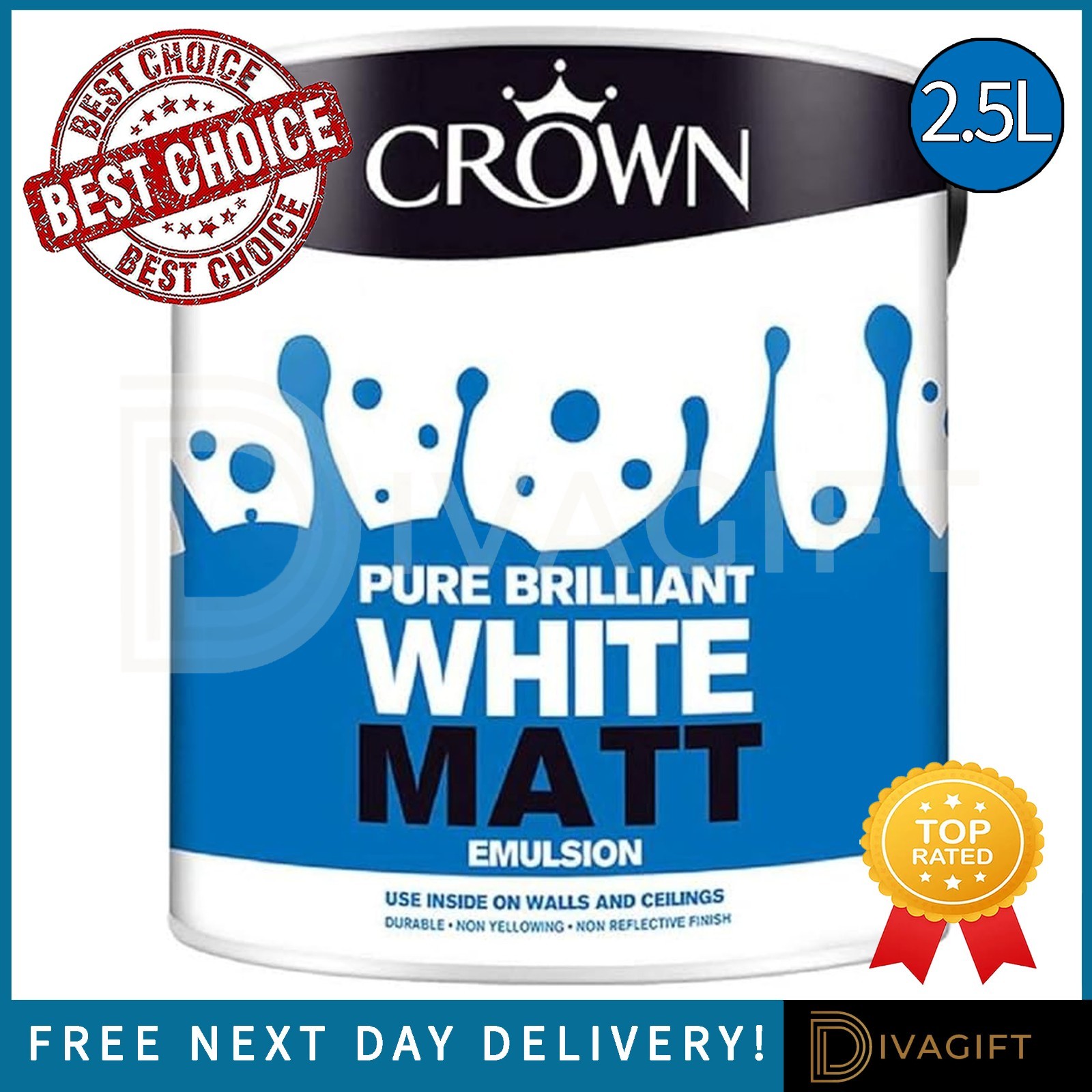 CROWN MATT EMULSION PAINT PURE BRILLIANT WHITE 2.5L FOR WALLS & CEILINGS NEW
