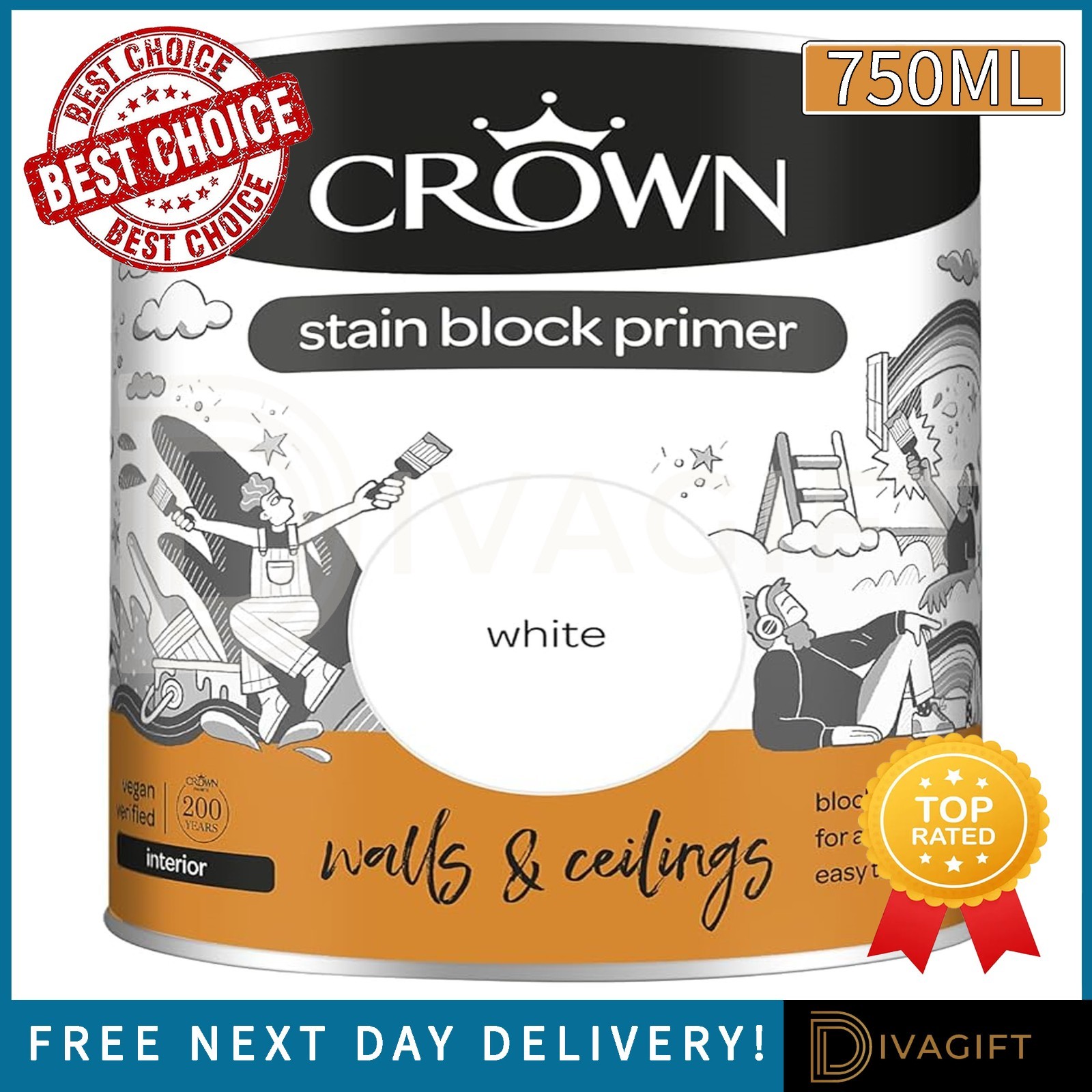 CROWN STAIN BLOCK PRIMER WHITE PAINT 750ML FOR INTERIOR WALLS & CEILINGS NEW