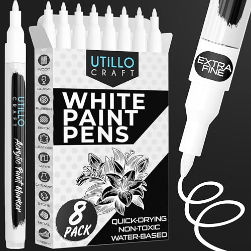 Utillo Craft White Paint Pen (8-Pack) for Rock Painting, Wood, Glass, Tire, Canvas, Metal, Fabric | Extra Fine 0.7mm Tip Made in Japan | Bold Color Acrylic White Paint Markers | Perfect Art DIY Gift