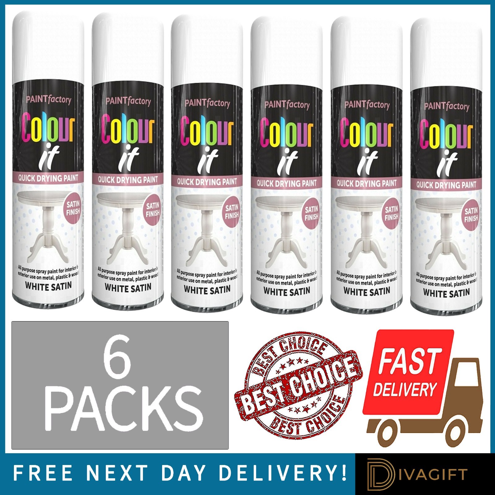 6 x WHITE SATIN FINISH AEROSOL SPRAY PAINT 250ML FOR METAL WOOD PLASTIC FAST DRY