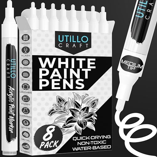 Utillo Craft White Paint Pen (8-Pack) for Rock Painting, Wood, Glass, Tire, Canvas, Metal, Fabric | Medium 2-3mm Tip Made in Japan | Bold Color Acrylic White Paint Markers | Perfect Art DIY Gift