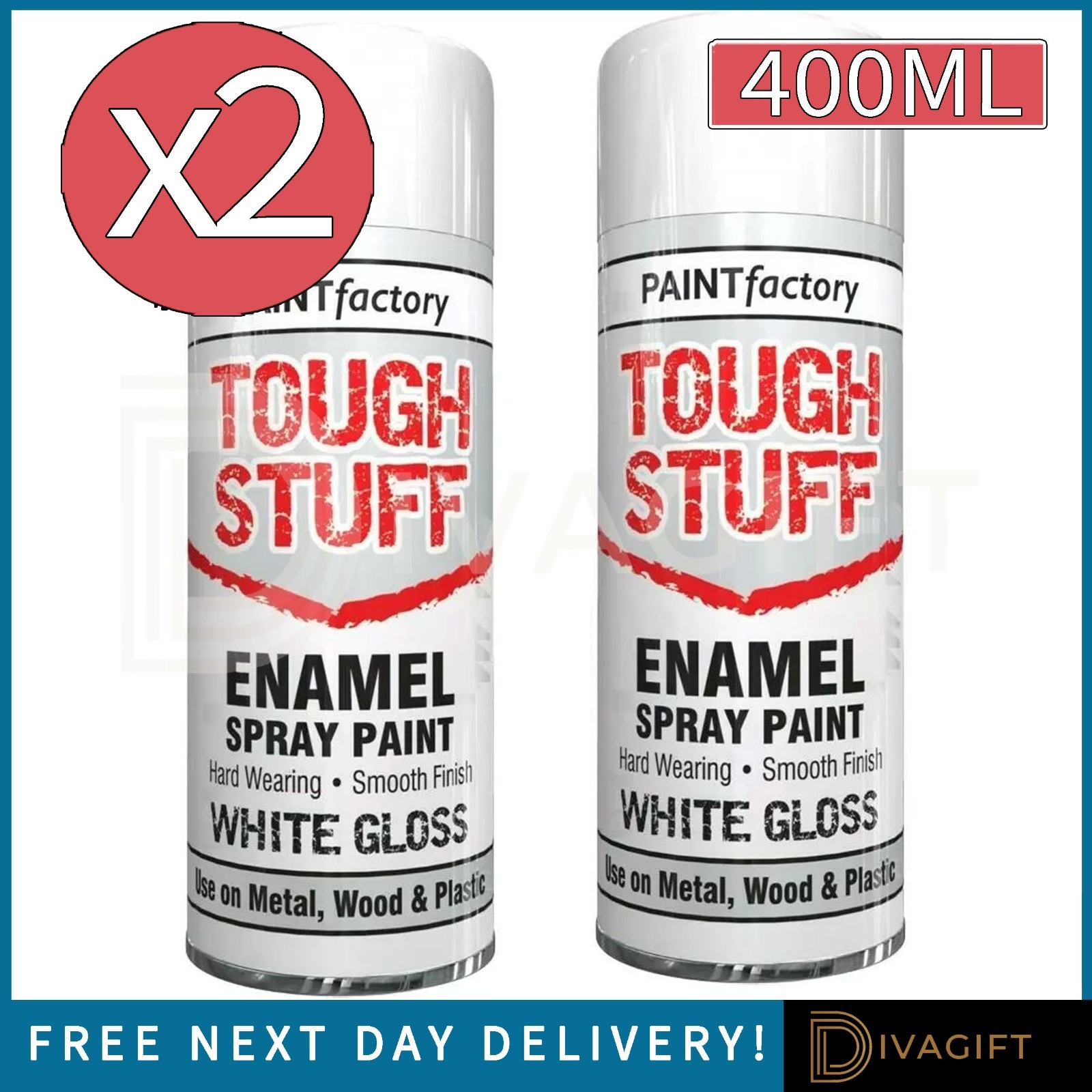 2 x 400ML ENAMEL WHITE GLOSS SPRAY PAINT WOOD METAL PLASTIC CRAFT TOUGH STUFF