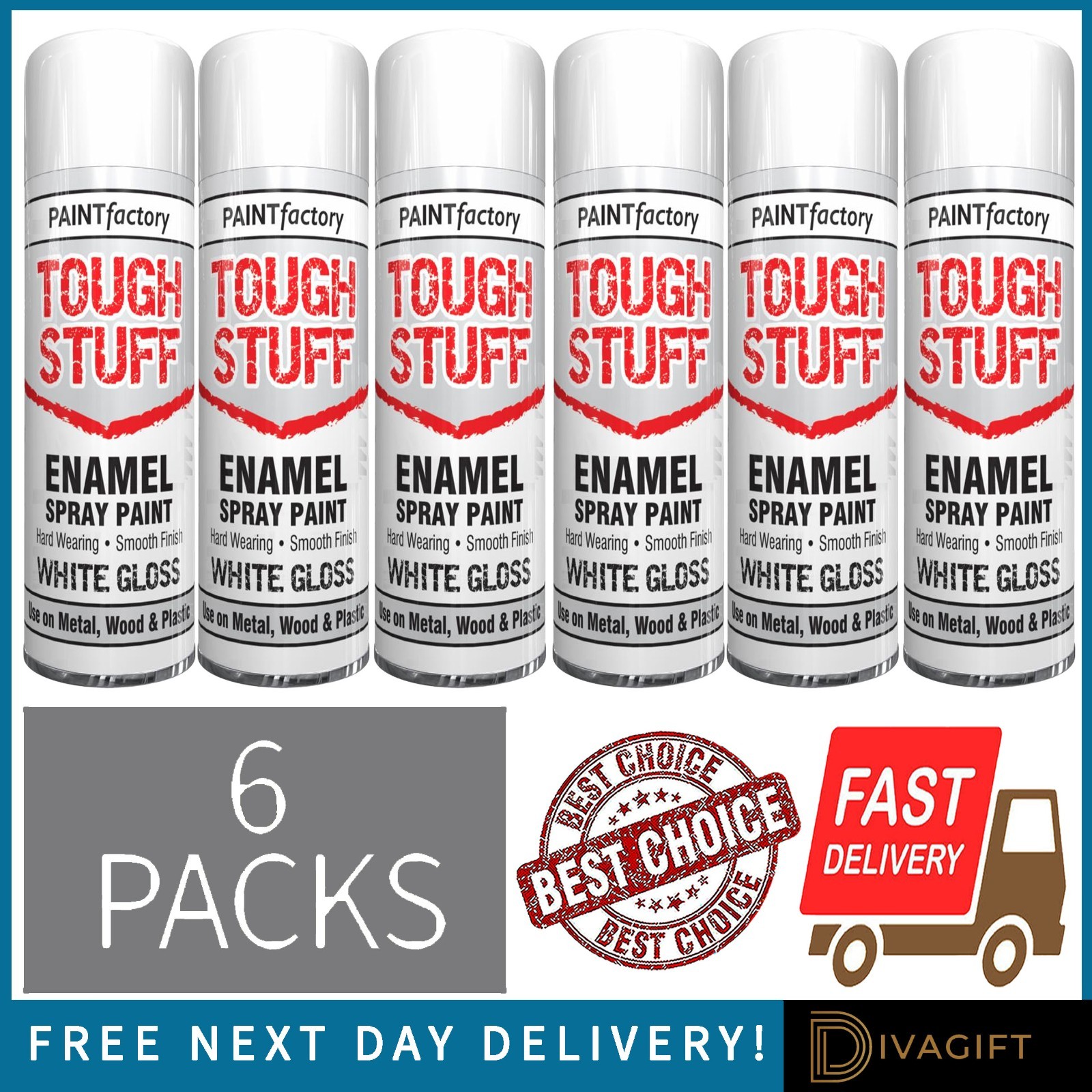6 x 400ML ENAMEL WHITE GLOSS SPRAY PAINT WOOD METAL PLASTIC CRAFT TOUGH STUFF