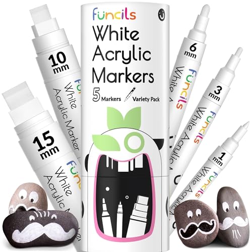 Funcils 5 Acrylic White Paint Pens - Fine & Jumbo Size Ink Pens (1mm, 3mm, 6mm, 10mm, 15mm) - Permanent White Marker Ink for Rock Painting, Fabric, Tire, Metal, Wood, Canvas, Glass, Plastic, Ceramic