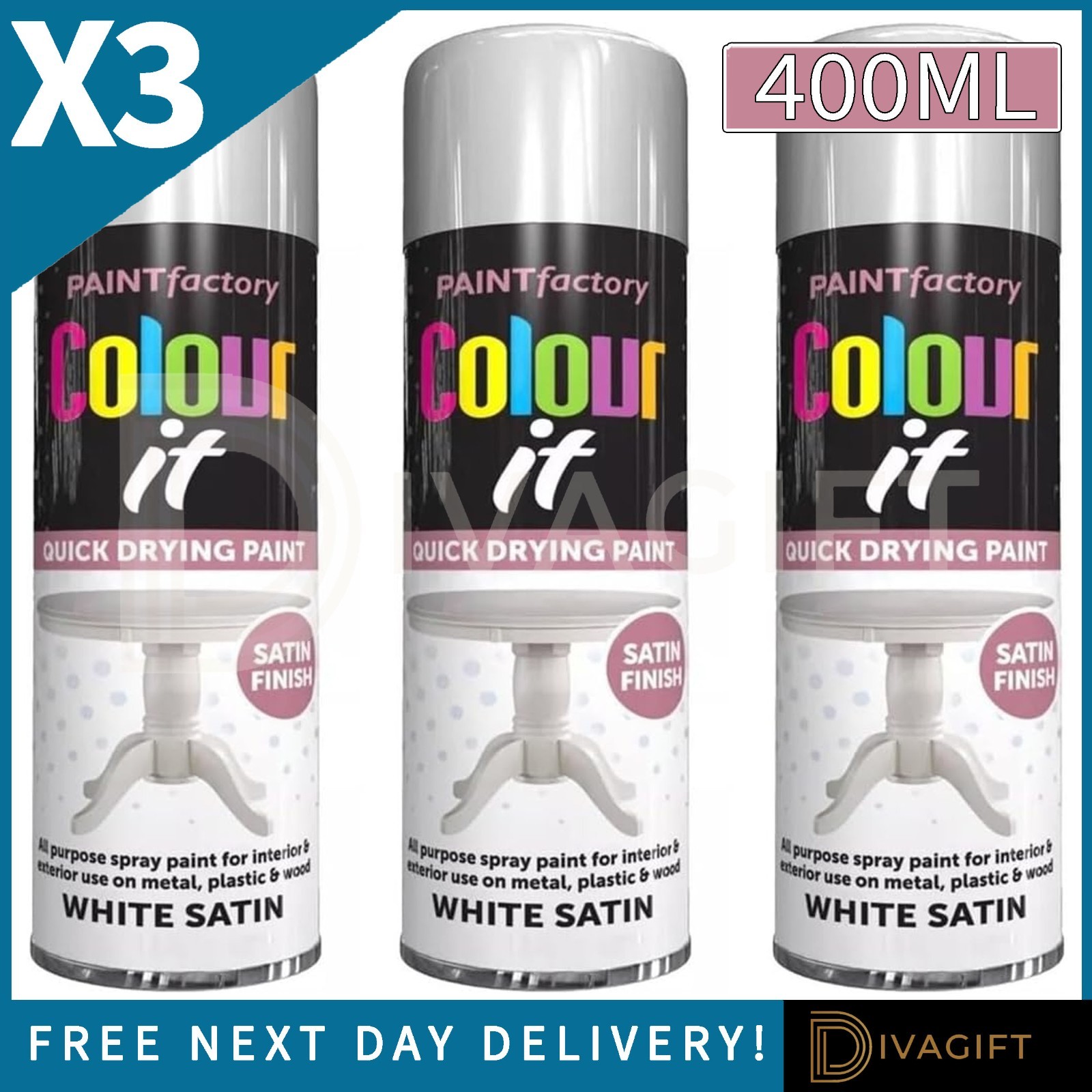 3 x WHITE SATIN FINISH AEROSOL SPRAY PAINT 400ML FOR METAL WOOD PLASTIC FAST DRY