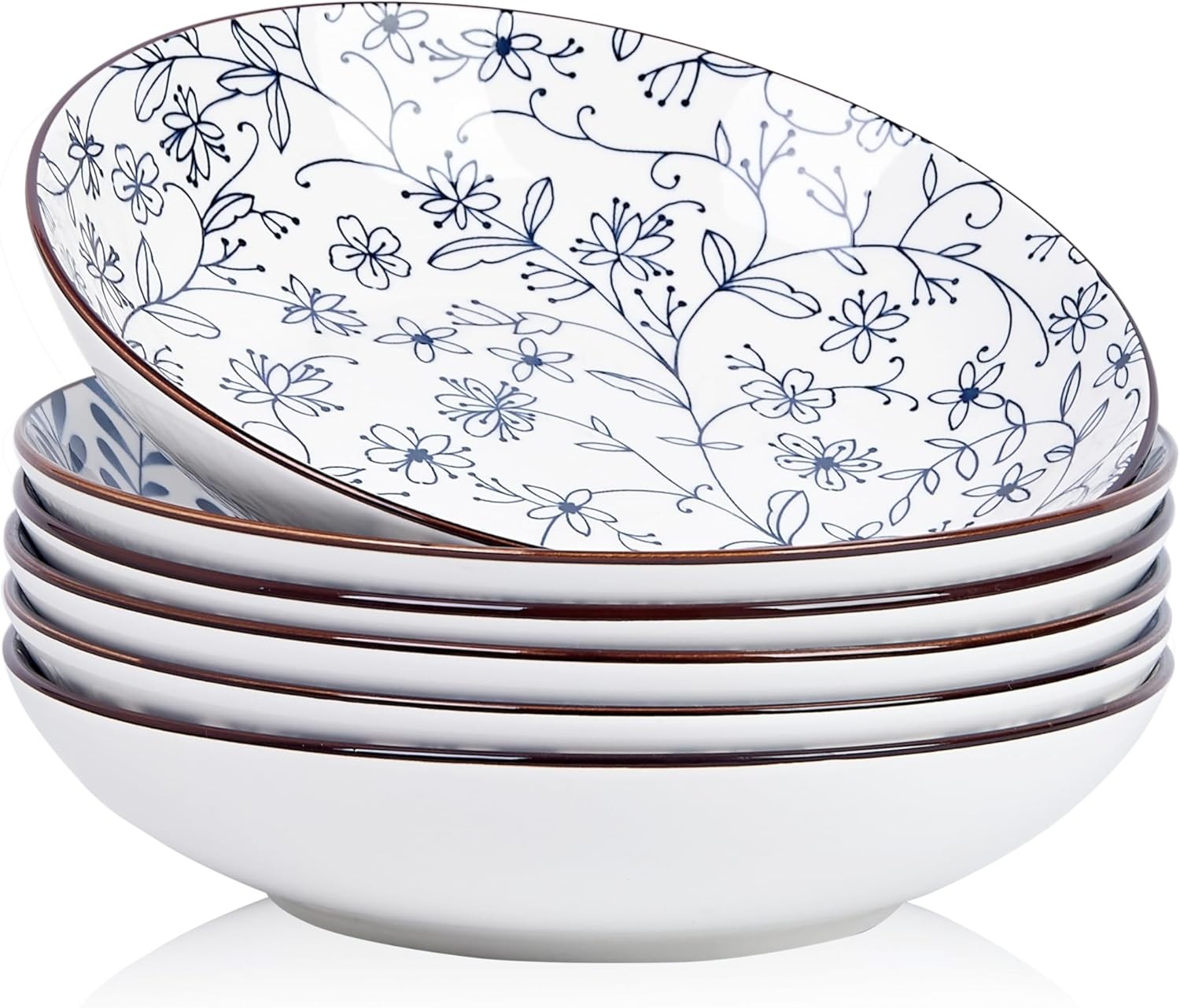 Set Of 6 Blue & White Floral Pasta Bowls Fine China Round Kitchen Food Tableware