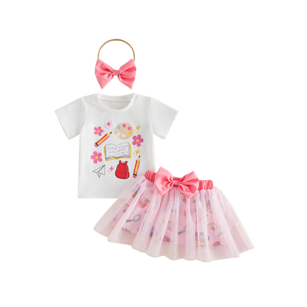 (1-2 Years, White) Girl Back to School Outfit Floral Pencil Print Short Sleeve Tops and Tulle Skirt Bow Headband 3 Pcs Set