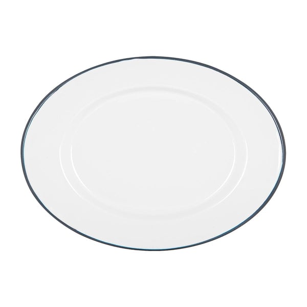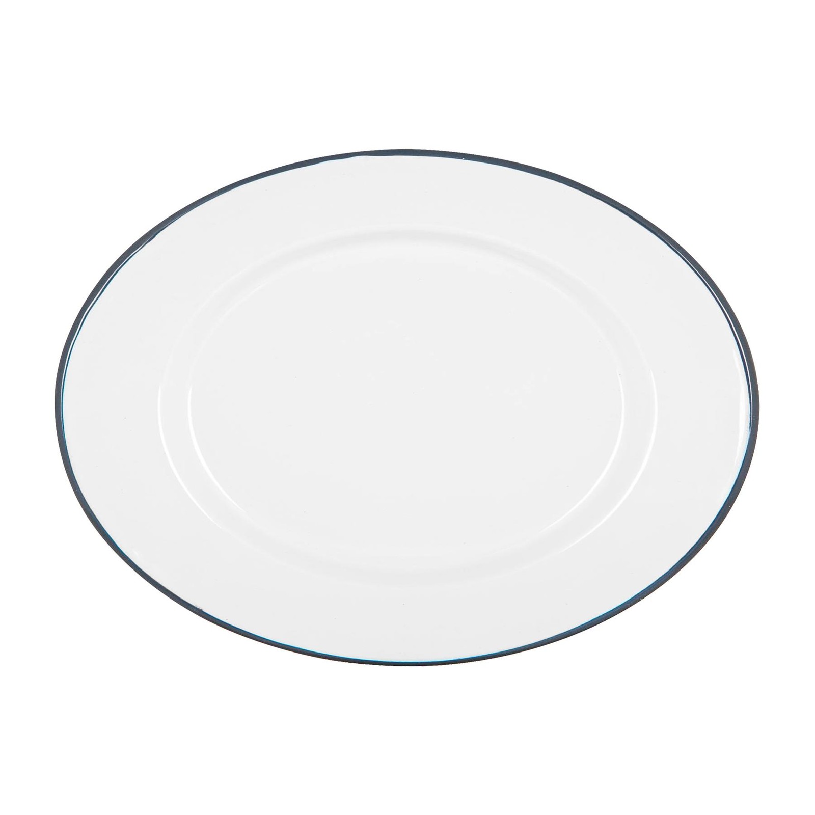 White Enamel Serving Platter - 30cm x 22cm - Blue