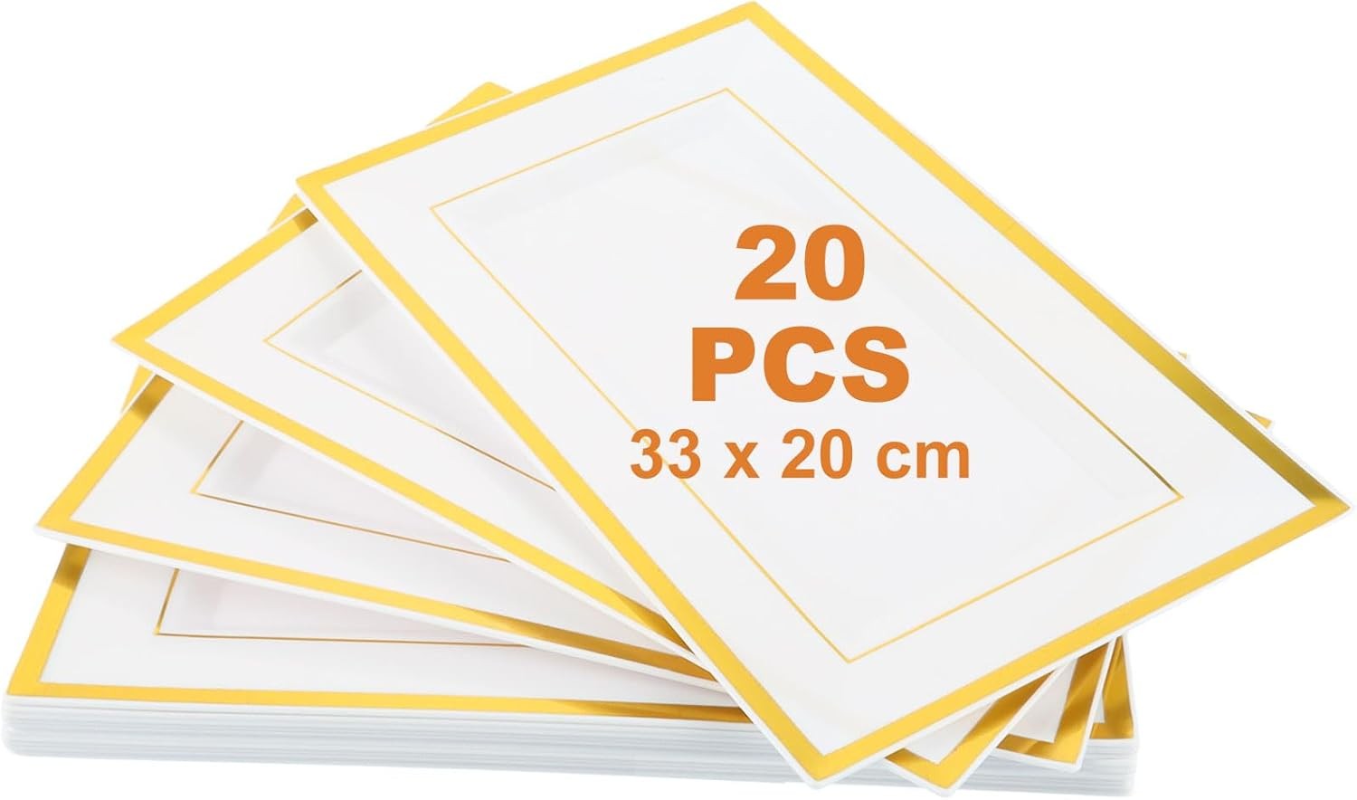 SHUESS 20 Pcs White Plastic Serving Platter with Gold Border - 33 x 20 cm Recta