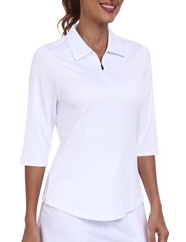 JINSHI Women's Golf Polo Shirts 3/4 Sleeve Golf Top Quick Dry UPF 50+ Casual Work Sports Tennis Shirts with 1/4 Zip White Size US M
