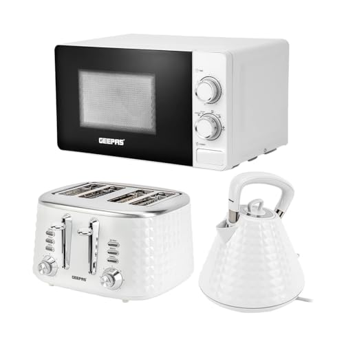 Geepas Electric Kettle 4 Slice Bread Toaster & Microwave Kitchen Set | 3000W 1.5L Traditional Pyramid Kettle | 1750W Toaster with 7 Level Browning Control | 700W Solo Manual Dial Microwave 20L | White