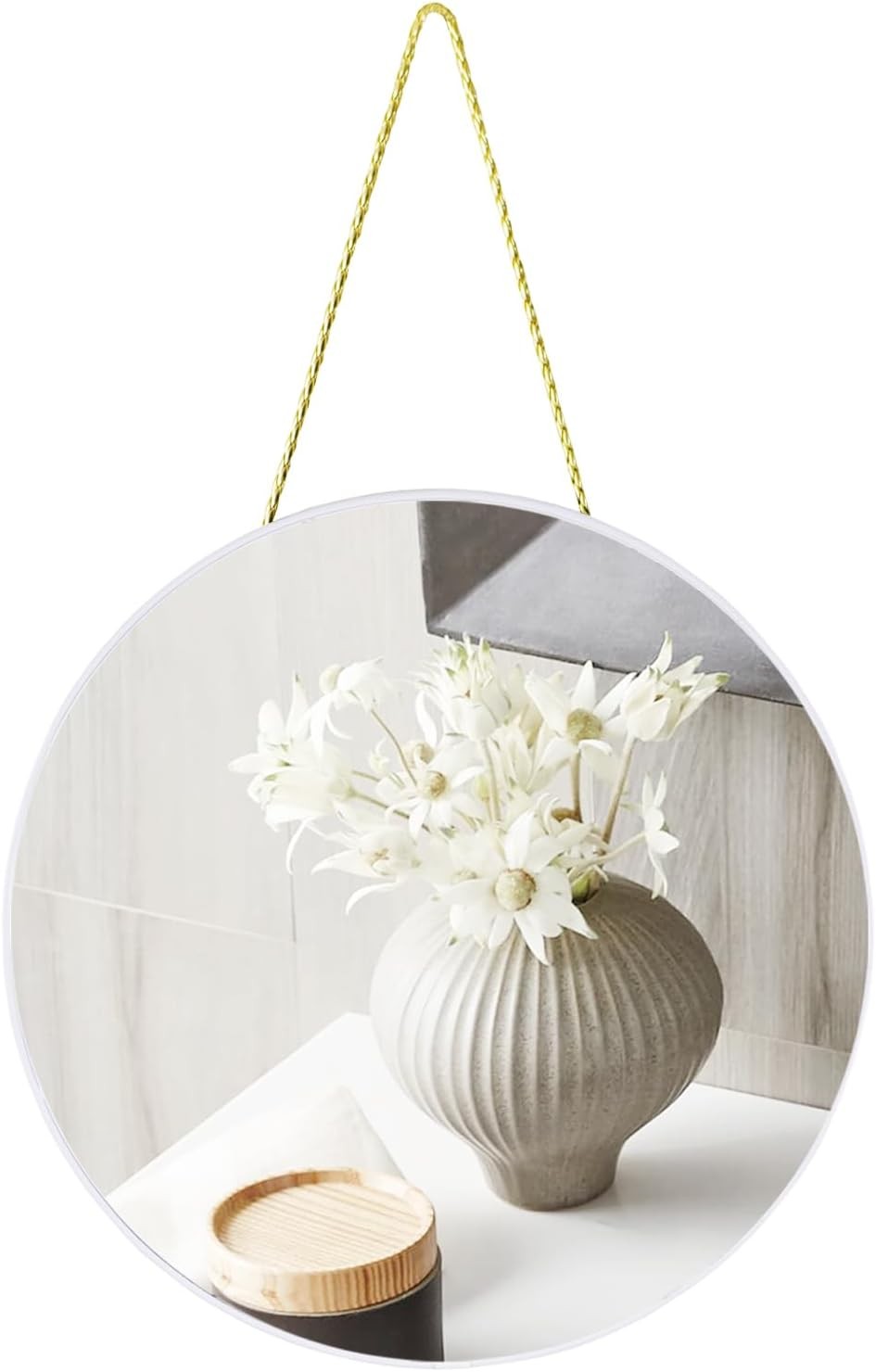 White Round Mirror 25 cm, Round Vintage Circle Metal Framed Wall Mirror with Ha
