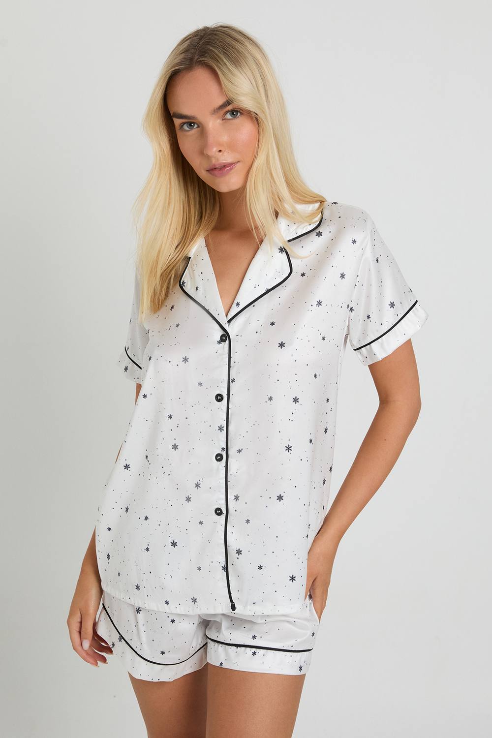 Womens Christmas Snowflake Print Satin Short Sleeve Shirt & Shorts Pyjama Set - White - 10, White