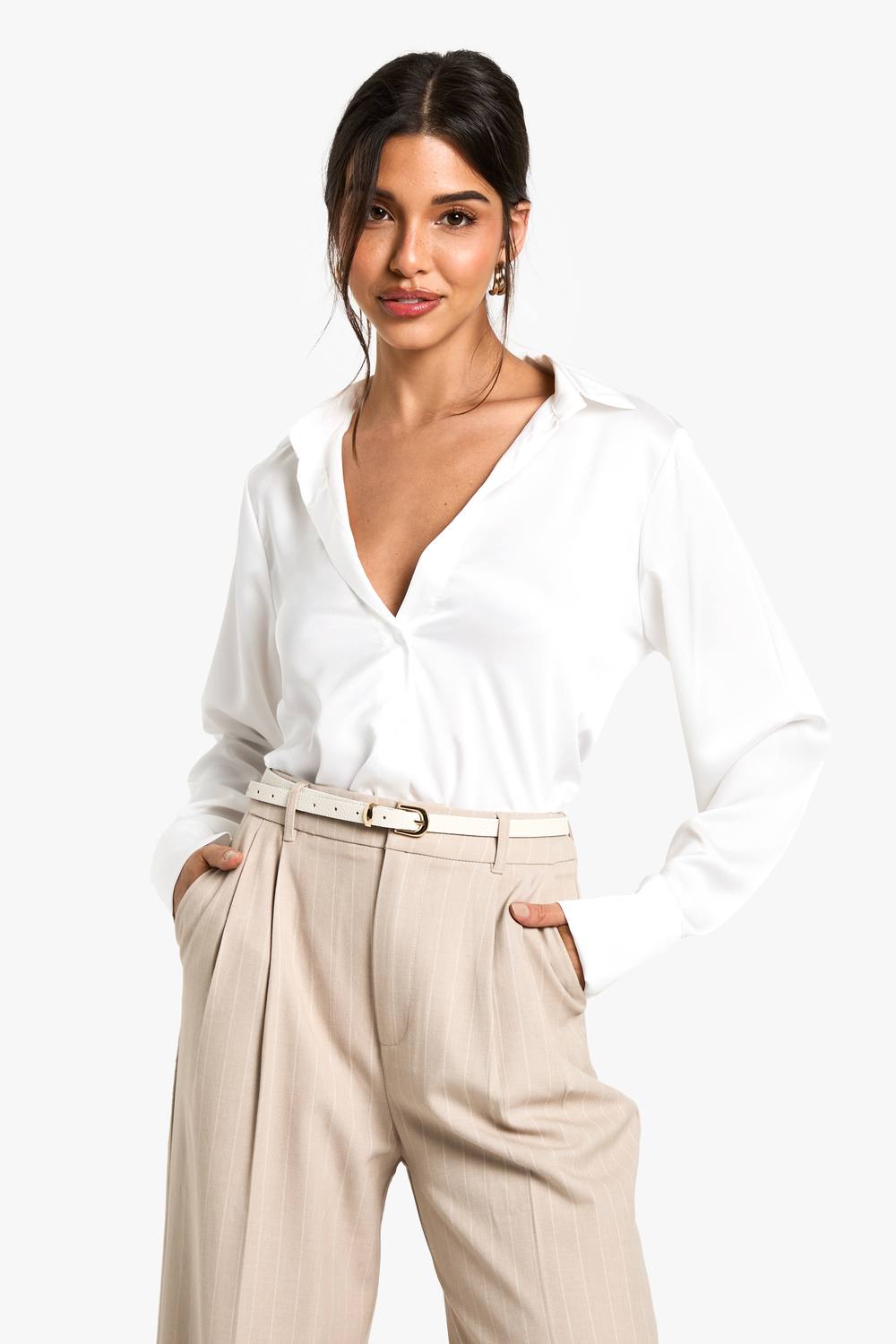 Womens Satin V-Neck Button Up Shirt - White - 12, White