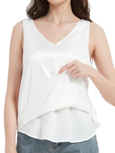 Monbessi Camisole Tops for Women V Neck Sleeveless Ladies Vest Tops Satin Ladies Tank Top Casual Loose(M, White)
