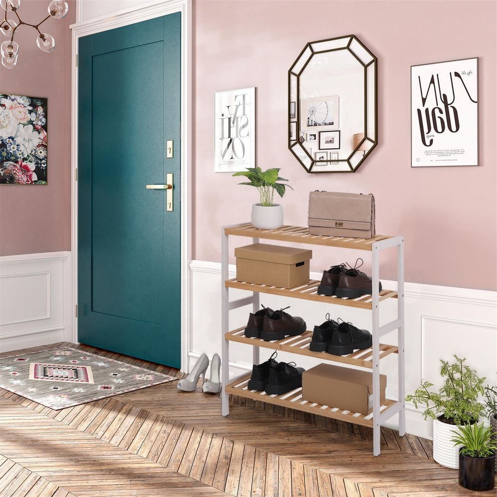 Shoe Organizer Entry: multi-part shelving rack, adjustable shoe display frame | Sturdy metal structure supports a multi-pair arrangement co