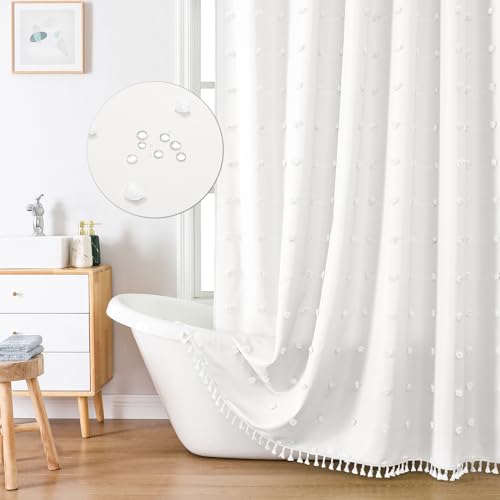 LilyCat Boho Farmhouse White Fabric Shower Curtain, 72x72 Tufted Pleat Floral Puffs Textured Tassel Cute Rustic Vintage Shower Curtain for Bathroom, Minimalist Cloth Shower Curtain Set with Hooks
