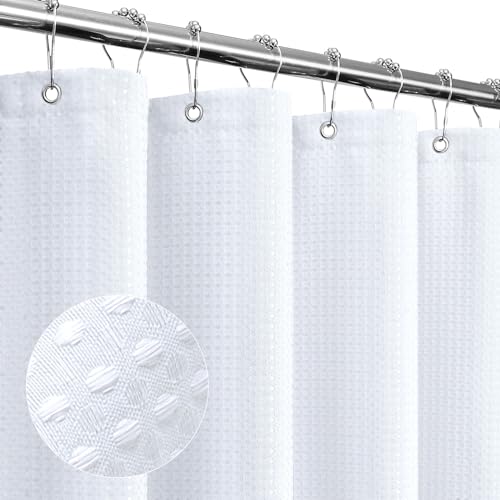 BTTN White Waffle Shower Curtain, Weighted Mould Proof Resistant Fabric Wet room Shower Curtains, Heavy Duty Waterproof Washable Thick Cloth Shower Curtain Set with 12 Plastic Hooks(182 x 182cm Drop)