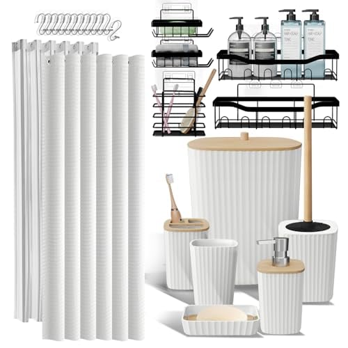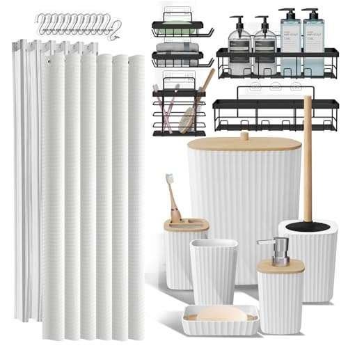 Shower Caddy and Bathroom Accessories Set 25PC Bathroom Accessory Set with Shower Shelf Caddy for Bathroom Storage, White Shower Curtain Set, Toilet Brush, Trash Can, Soap Dispenser, Toothbrush holder