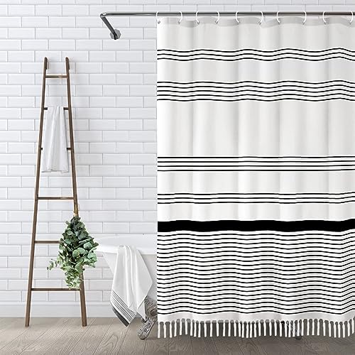 Awellife Black and White Boho Shower Curtain for Bathroom Stripe Tassel Shower Curtain Farmhouse Cotton 72" L x 36" W