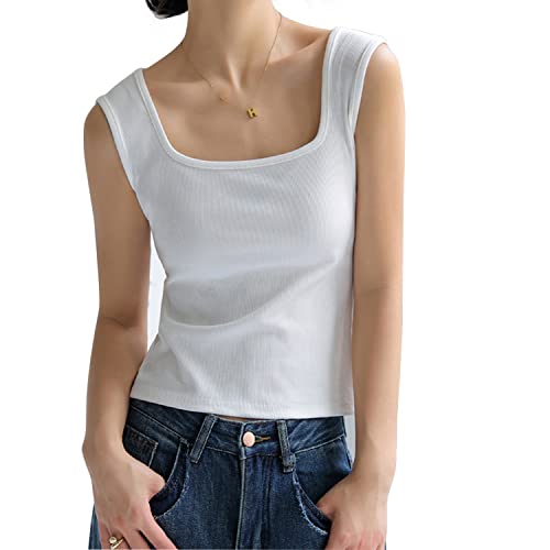 Danysu Women Cotton Rib Tank Top with Built in Bra Square Neck Crop Tank Fitted Basic Tops Angel White Solid L