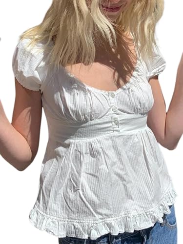 Geagodelia Womens Ruffle Y2K Top Puff Short Sleeve Square Neck Blouse T-Shirt Summer Fairy Grunge Aesthetic Vintage 90s Fashion Milkmaid Crop Top (B 01- White, S)