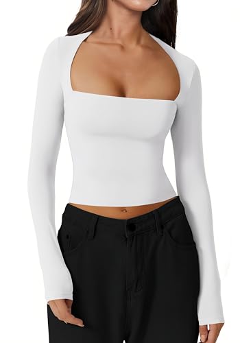 INFITTY Double Lined Top Women Casual Crop Tops Slim Fit Top Square Neck Long Sleeve Tight Basic Blouse Tee Tops White L