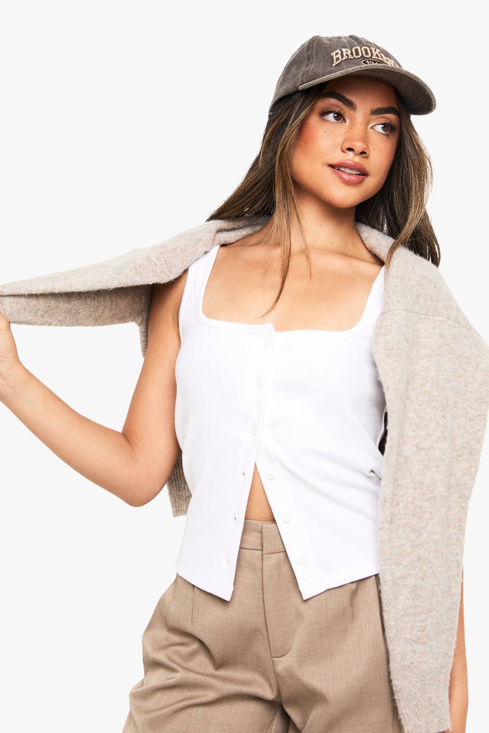 Womens Rib Button Through Square Neck Top - White - 10, White