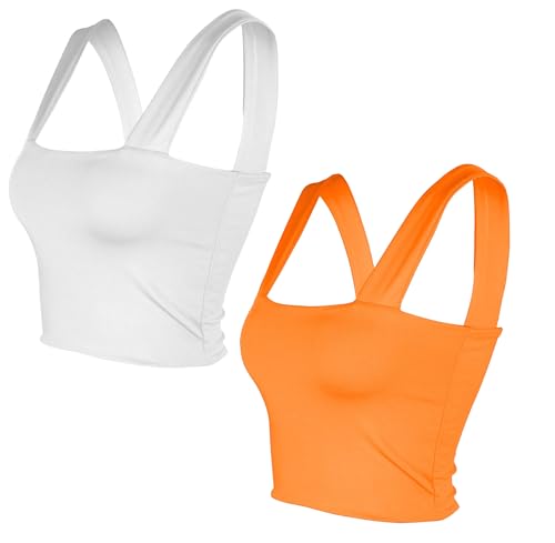 Womens 2 Pack Vest Sleeveless Strappy Crop Tank Top Square Neck Double Layer Fitness Casual Basic Tops XL Orange White