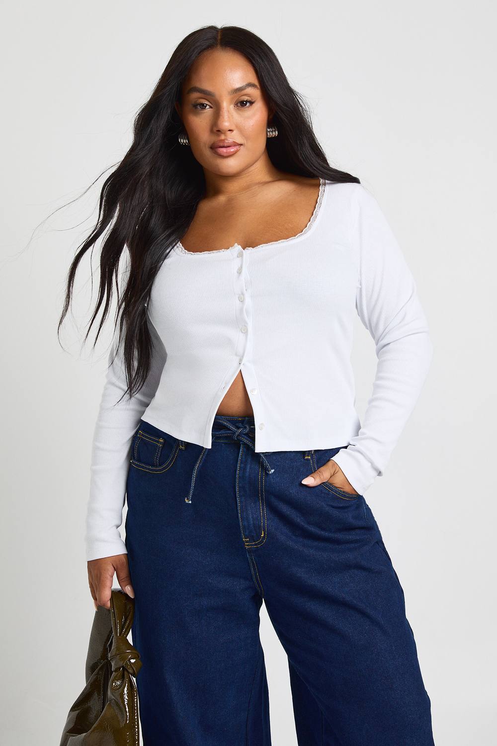 Womens Plus Rib Lace Trim Square Neck Long Sleeve Top - White - 20, White