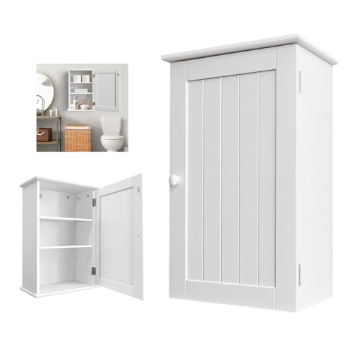 Bathroom Cabinet Wall Mounted, Small White Wooden Storage Unit, Wall Cabinet Kitchen Storage Cupboard Hanging Bathroom Wall Organiser Unit, Single Doors with Adjustable Shelf, 21x35x55 cm, White