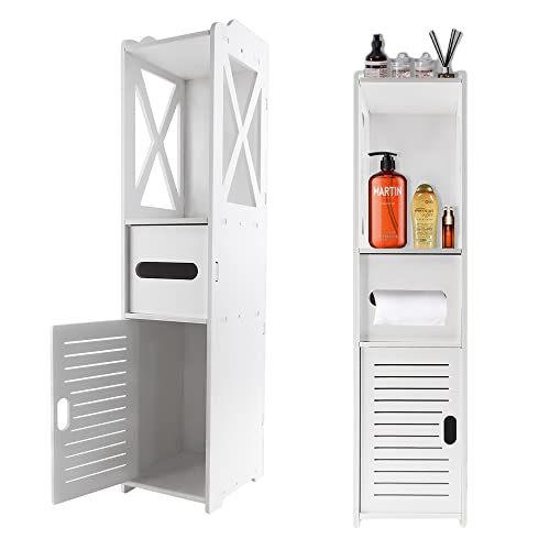 AUTOFU Waterproof Bathroom Cabinet Free Standing White Floor Storage Unit Cupboard Furniture 81cm Tall Slim Tall Cabinet for Toilet Bedroom Kitchen Living Room with Paper Tissue Shelf