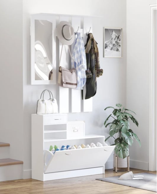 White Hallway Shoe Storage Unit Coat Rack Stand Bench Shelf Cabinet Mirror Hooks