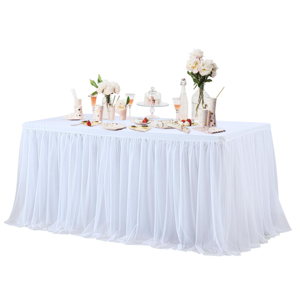 2-in-1 White Tablecloths with Tulle Table Skirt for 6 Foot Rectangle Tables Party Ruffle Tutu Table Skirt Stretch Fitted Covers for Wedding Receptio