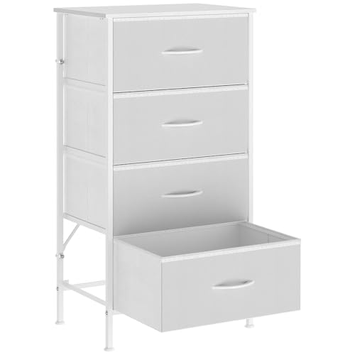 KU Syang Dresser with 4 Drawers - Fabric Chest of Drawers with Large Storage Space, Modern Tall Tower Unit Storage Organiser for Living Room/Bedroom, Wooden Top and Metal Frame (White)