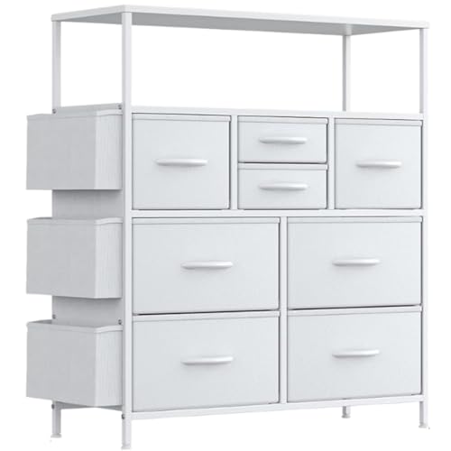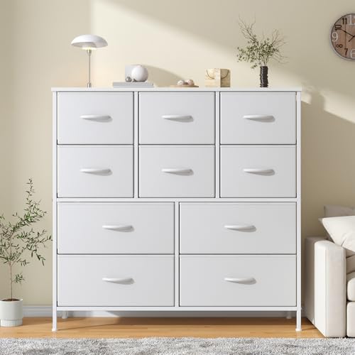 Feonase Chest of Drawers,Bedroom Tall Dresser with 10 Fabric Drawers, Metal Frame & MDF Wood Top, Adjustable Feet, Storage Organizer Unit for Bedroom, Closet, Living Room, Office Hallway, White