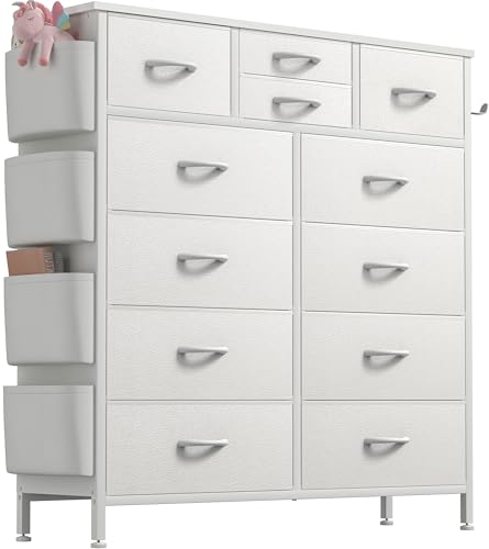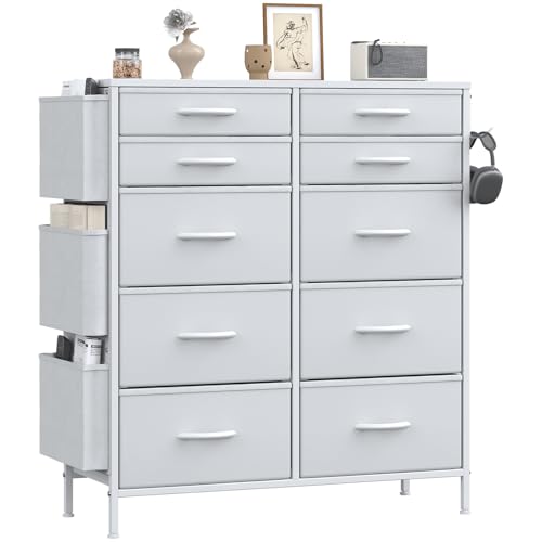 Buluri Chest of Drawers Bedroom, 12 Fabric Drawers Dresser with Side Pockets and Hooks, Wooden Top and Metal Frame, Tall Drawers for Closet, Living room, Kids Room (White)