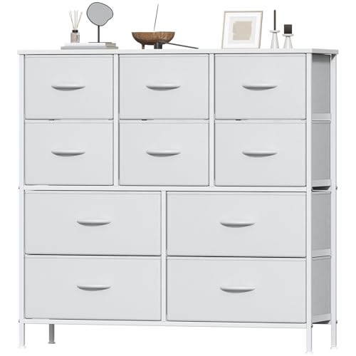 Feonase Chest of Drawers,Bedroom Tall Dresser with 11 Fabric Drawers, Metal Frame & MDF Wood Top, Adjustable Feet, Storage Organizer Unit for Bedroom, Closet, Living Room, Office Hallway, White