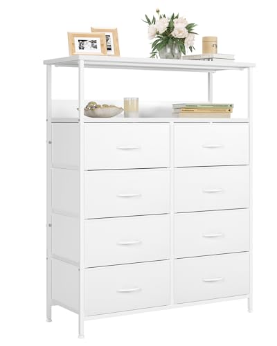 MYGIIVOVO Chest of Drawers, Dresser for Bedroom with 8 Fabric Drawers, Tall Storage Organizer Unit with 2 Layers Shelf, TV Stand with Sturdy Metal Frame (White)