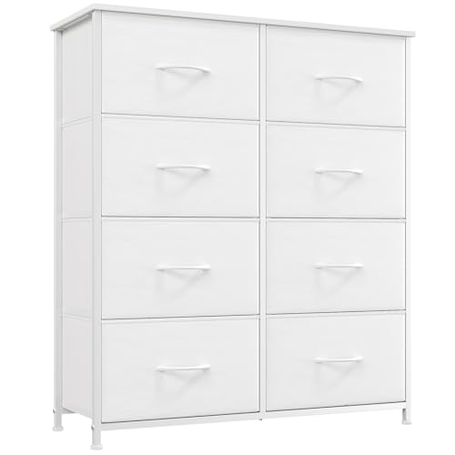 Mintnook Chest of Drawers, White Dresser for Bedroom with 8 Fabric Drawers, Tall Bedroom Chest with 2-Layer Wooden Top and Sturdy Metal Frame for Closet, Nursery, Living Room (White)
