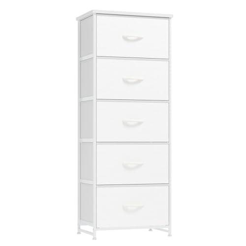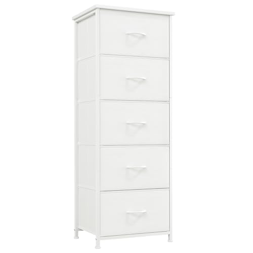CAIYUN Chest of Drawers, 5 Drawer Tall Dresser, Fabric Dresser for Bedroom Closet Entryway Hallway Nursery Bedside, Storage Organiser Unit, White