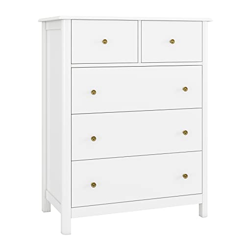 Karl home White Chest of Drawers, Tall 5 Drawer Dresser, Wood Storage Organizer with Anti-Tipping Design, Metal Runner, Gold Metal Handles for Bedroom, Living Room, Hallway, Entryway