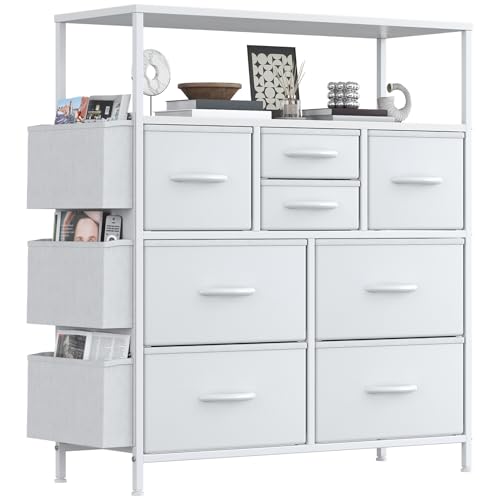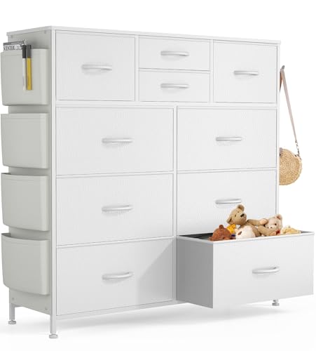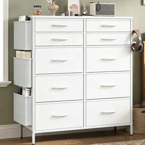 Feonase Chest of Drawers Bedroom, Tall Fabric Dresser with 10 Drawers, 3 Side Pockets & 2 Hooks, Metal Frame, Wood Top, Storage Organizer for Bedroom, Living Room, Hallway, Closet (White)