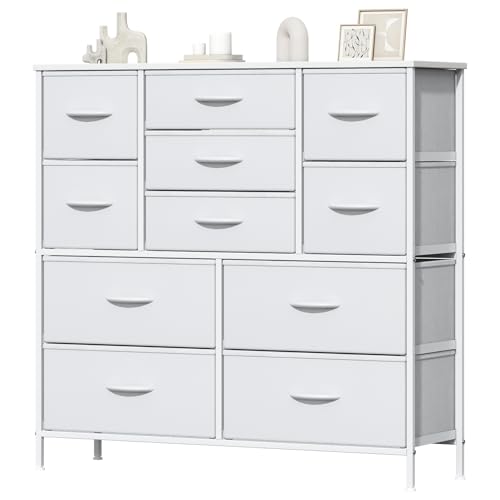 Feonase Chest of Drawers, Bedroom Tall Dresser with 11 Fabric Drawers, Metal Frame & MDF Wood Top, Adjustable Feet, Storage Organizer Unit for Bedroom, Closet, Living Room, Hallway, White