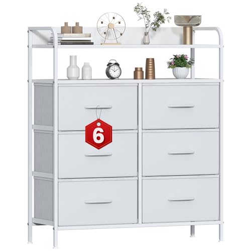 GoaHi Chest of Drawers, Dresser for Bedroom with 6 Fabric Drawers, Tall Storage Organizer Unit with 2 Layers Shelf for Bedrooms,Living Rooms, Sturdy Storage Dresser, White