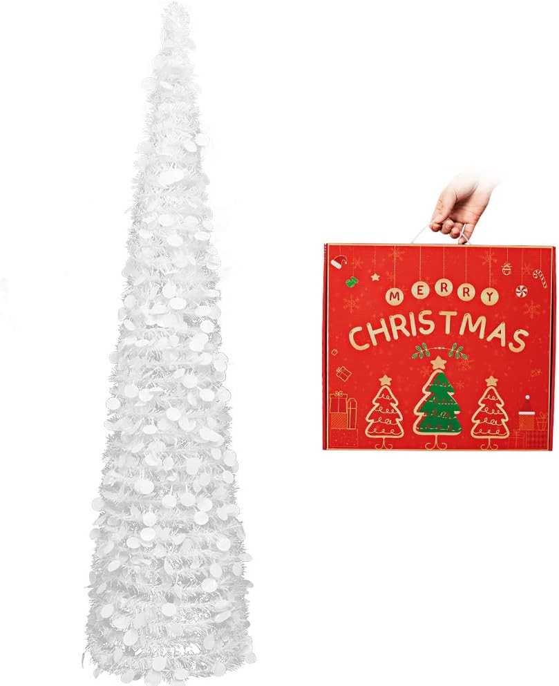 5ft Collapsible Artificial Christmas Tree, Pop Up White Tinsel Coastal Christmas Tree for Holiday Carnival Party Home Office Fireplace Decorations