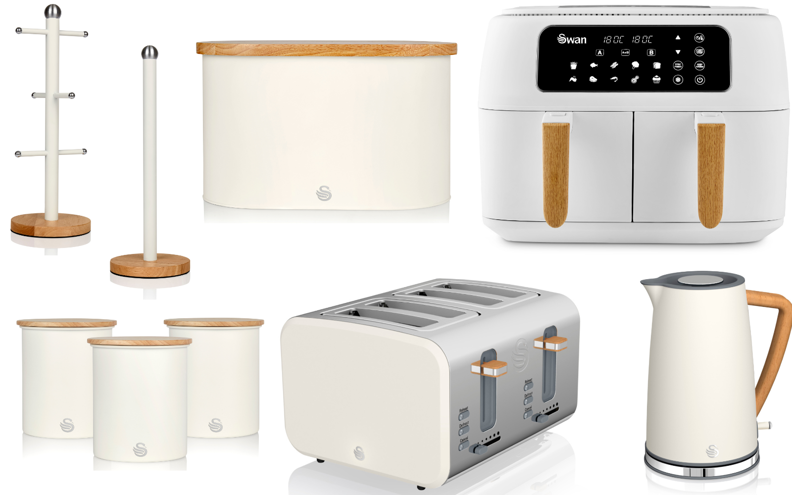 Swan Nordic White Kettle Toaster Dual Basket Air Fryer Breadbin & Canisters Set