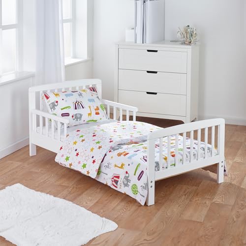ELEGANT BABY Complete 5 Piece Kids White Toddler Bed Bundle with Kinder Flow Mattress and Circus Friends Reversible Bedding Set | Junior Bed and Children's Bed