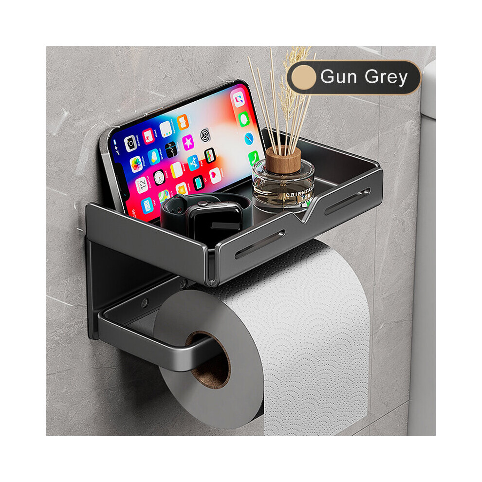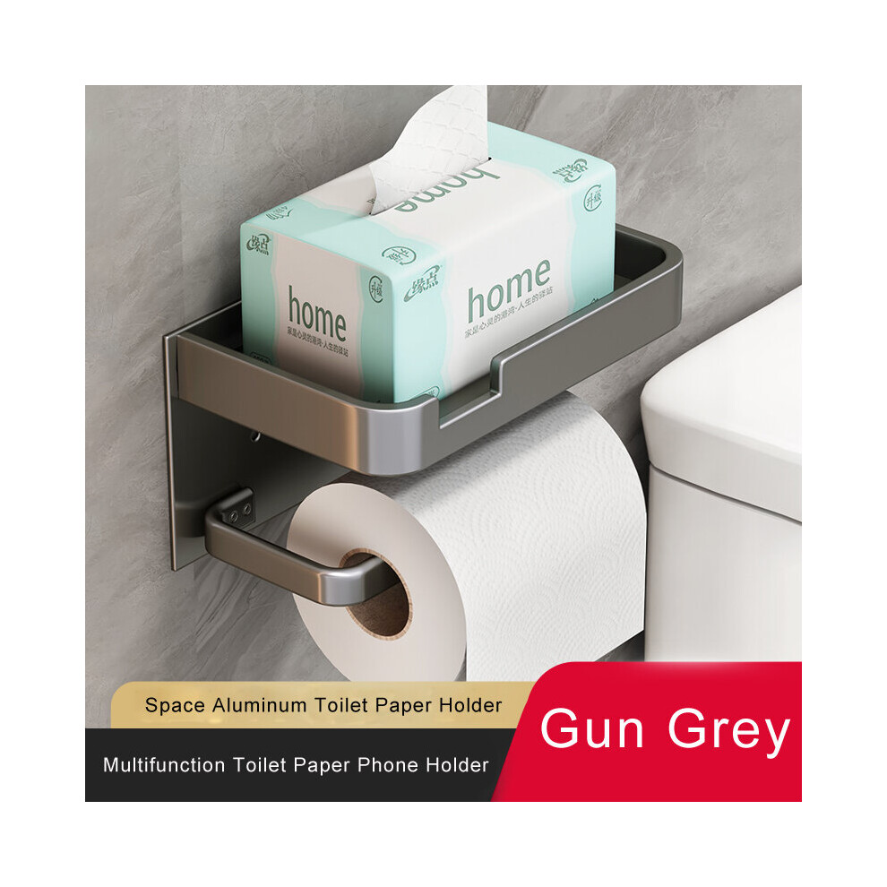 (a-Gun Grey G) Aluminum Bathroom Double Bar Toilet Paper Holder with Shelf Wall Toilet Phone Holder Black Grey White Toilet Paper Roll Holder